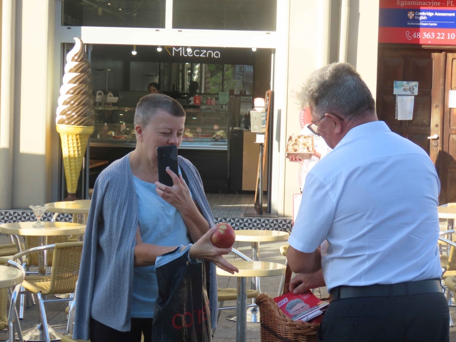 Przy  okazji  rozdawaliśmy  też  ulotki  kandydatek  i  kandydatów  Nowej Lewicy w  najbliższych  wyborach  do Sejmu .W  akacji  wzięli udział  Daniel Oliszewski - jedynka  na  liście  Nowej Lewicy w naszym okręgu, a także  sadownik z  powiatu  grójeckiego, producent między  innymi  jabłek.